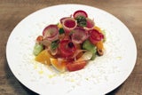 また、季節酒や限定酒も味わえる食堂うめぼしでは、日本酒ラバーにぴったりのおつまみも用意。中でもイチ押しは、「鶏しおユッケ」(560円)です。主役は低温調理により、まるで生ハムのようにしっとり仕上げた鶏ハム。ゴマ和風ドレッシングは香ばしくも爽やかな酸味があり、あっさりしたつまみで飲みたい日にも試してほしい逸品です。