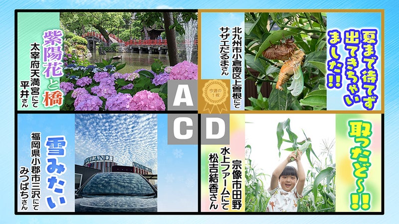 RKBテレビ「タダイマ!」内で毎週水曜日の午後4時台に放送している、花鳥風月「投稿ピクチャーズ」。視聴者の皆さんから毎週送られてくる、季節感溢れる自慢の写真10~20枚の中から、まず4枚を選びスタジオで紹介します。4枚に選ばれた皆さんには、もれなく豪華(?)賞品が贈られます。そしてオンエアー内で出演者に、その中から一1番の写真を決めてもらいます。その「今週の一枚」になると、さらにクオカードをプレゼント!