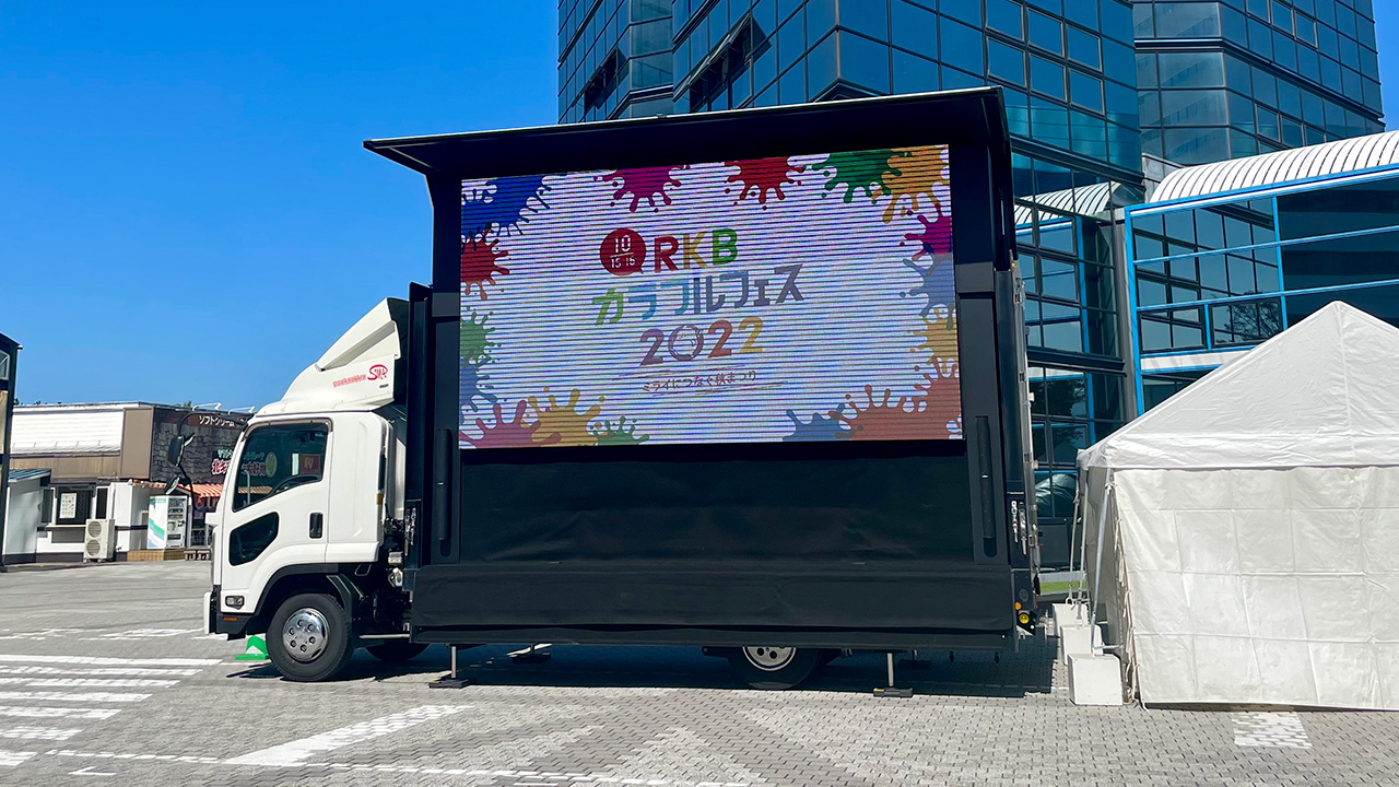 福岡タワーの前で、カラフルフェス会場のアイコン的役割を担うLEDビジョンカーです。パフォーマンスゾーンで実施されるコンテンツから、当日のRKBテレビの特別番組やRKBオンラインでのライブ配信、さらにRKBテレビのおすすめレギュラー番組まで放映します。会場内各コンテンツの案内もご覧になれます。
