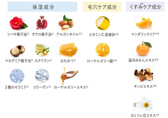 ※保湿成分 ※1アルガニアスピノサ核油(保湿成分) ※2テトラヘキシルデカン酸アスコルビル(整肌成分) ※3 10-ヒドロキシデカン酸(保湿成分) ※4マンダリンオレンジ果皮エキス(整肌成分) ※5ウンシュウミカン果皮エキス(整肌成分) ※6オレンジ果皮エキス(整肌成分) ※7整肌成分 *保湿・エモリエント・皮膚コンディショニング成分の合計、水を含む *1乾燥してキメが乱れた肌印象のこと