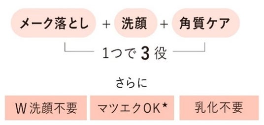 これ1つで[洗顔+メーク落とし+角質ケア]まで完了。W洗顔不要で洗いすぎによる乾燥から肌を守ります。さらに濡れた手でも使えて、マツ毛エクステをした目元にもご使用が可能★。洗い流す際の乳化も不要で、クレンジングのあらゆる手間やストレスから解放します。