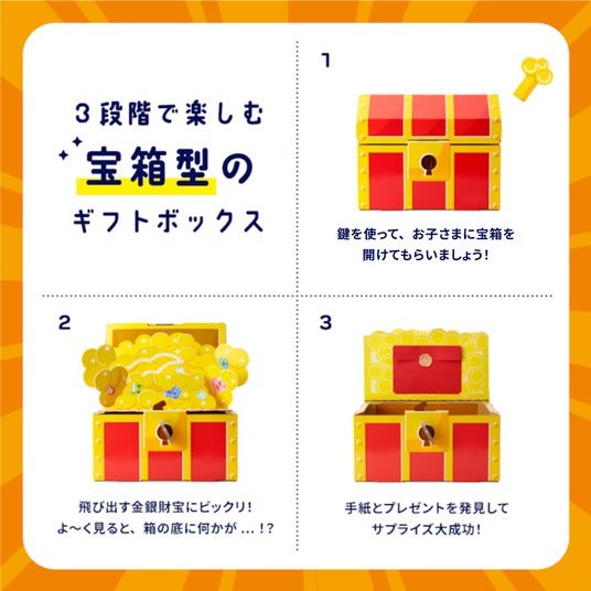 鍵がついているので、お子様や大切な人に喜ばせる瞬間を計画的に演出できます。鍵をどこかに隠し、鍵探しを楽しんでみたり、お祝いする方に関するクイズに答えられたら、鍵を開けるなど、いつもと違うコミュニケーションを図ることができます。また、飛び出すシートの裏には、メッセージカードをセットできるので、いつもは伝えづらい特別なメッセージを伝えることができます。