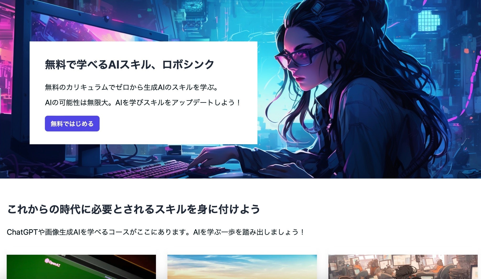 ロボシンクでは動画を中心とした教材で話題のChatGPTや画像生成AIの使い方を無料で学ぶことができます。