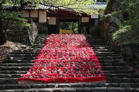 秋月城跡内の長屋門前では、野外の石段に約600体もの雛人形が飾られます。