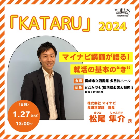 株式会社長崎国際テレビ(本社:長崎市、代表取締役社長:川畑年弘、以下NIB)は、長崎県の「学生サークル形成事業」を運営する一環として、学生のみなさんが就職活動の基本を学べる講演会・ワークショップ「KATARU2024」を1月27日(土)13時より長崎市立図書館(オンラインでも参加可能)で開催します。マイナビ講師による講演・自己分析ワークショップのほか、学生サークル「TSUNAGU」による企業訪問レポート・企業採用担当者に本音を聞くトークショーを実施。長崎の企業の魅力についても知ってもらい、将来、長崎で働くことを検討するきっかけをつくります。