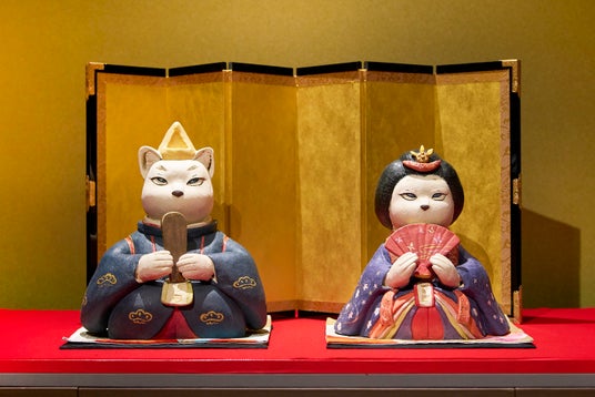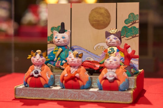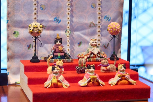 圧倒的な作品数を誇る本企画展は、7つの会場に「百段雛まつり」、「座敷雛(福岡・飯塚)」、「うしくのひなまつり」、「清湖雛物語」、「極小の雛道具(川内由美子コレクション)」、「猫たちの雛まつり」、「早春を彩るてまり」と、エリアテーマを設け、およそ1,300点の人形とともに、さまざまな趣向の作品を展示しております。会場の一室で展示中の特別企画「猫たちの雛まつり」の作品を公開するとともに、おすすめの過ごし方をご紹介いたします。