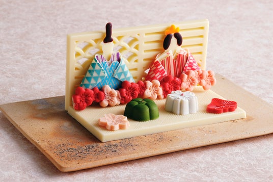 折り紙で作られた紙雛のようなチョコレート細工。お内裏様とお雛様の背景は屏風ではなく、ホテル雅叙園東京を象徴する組子細工をイメージしたホワイトチョコレートをあしらいました。