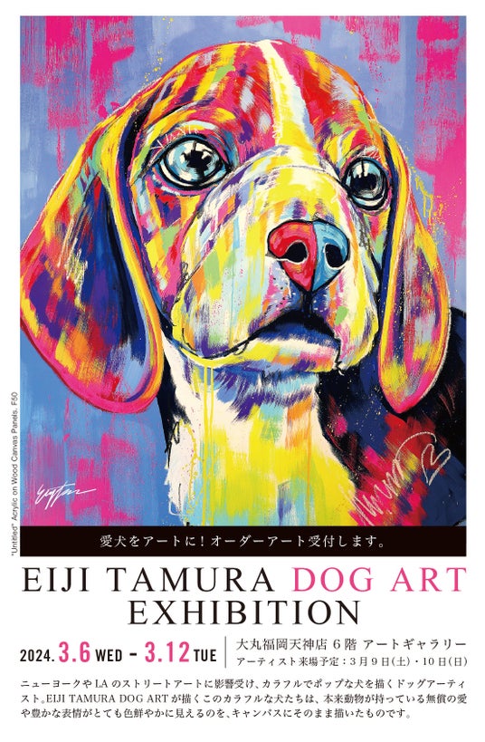 日本各地やニューヨークなど国内外で活躍するDOG ARTISTのEIJI TAMURA(田村英史・タムラエイジ/企業名:株式会社グレスティ 所在地:東京都渋谷区)は、2024年3月6日(水)~2024年3月12日(火)の期間、大丸福岡天神店 6階アートギャラリーにて、EIJI TAMURA DOG ART EXHIBITIONを開催いたします。