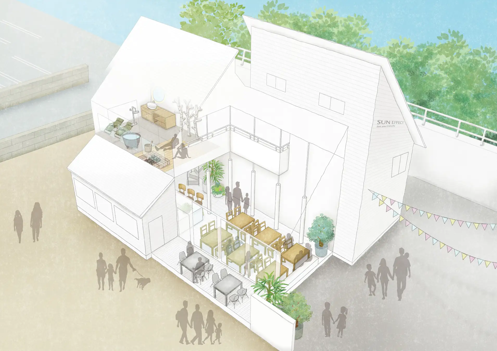 SUN EFFECTの目指す姿もそれと同じ。私たちは、お客様の心と身体にとって前向きなサービスをご提供することで、 輝かしい毎日をセットすることをミッションに、地域のランドマークとして新たなカタチを日々模索し続けていきます。