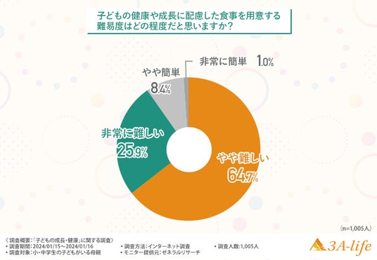続いて、「 子どもの健康や成長に配慮した食事を用意する難易度はどの程度だと思いますか」と質問したところ、『やや難しい(64.7%)』『非常に難しい(25.9%)』『やや簡単(8.4%)』『非常に簡単(1.0%)』という回答結果になりました。約9割の方が、子どもの健康や成長に配慮した食事を用意するのは難しいと感じていることが示されました。
