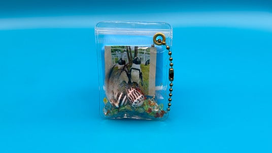 レジンをUVライトで固め、世界に一つだけのキラキラキーホルダーを作ります。