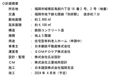 日本郵政不動産株式会社(東京都千代田区、代表取締役社長 山代裕彦)は、福岡市城南区鳥飼六丁目において、「(仮称)福岡鳥飼六丁目計画」の建設を推進してまいりましたが、この度その運営会社を「SOMPOケア株式会社」、施設名称を「SOMPOケア ラヴィーレレジデンス福岡別府」に決定いたしましたので、お知らせいたします。