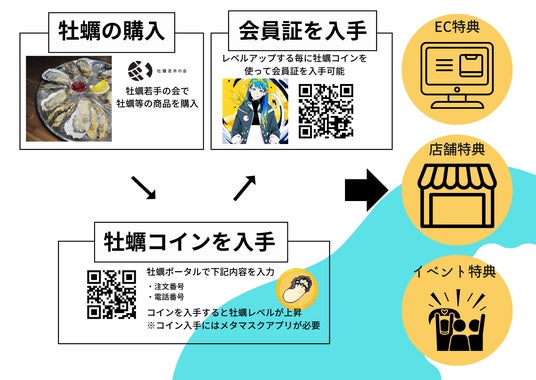 NFTの特性を使用し、牡蠣若手の会のECサイトで5%オフで牡蠣を購入できたり、牡蠣コインによる牡蠣のEat To Earn(食べて稼ぐ)も実施しています。
