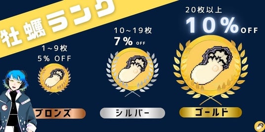 - 通販サイト「牡蠣若手の会」で保有枚数に応じたディスカウントを受けられます。牡蠣業界含む日本の一次産業を持続可能な産業にするためには生産者の利益率を向上させる必要があります。この仕組みにより、NFTをホルダーが「牡蠣若手の会」の通販サイトでリピート購入が増加し、産地直送(D2C)を加速させ利益率の向上を目指します。