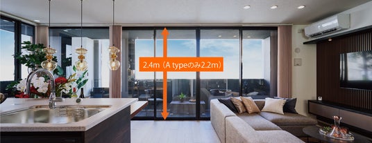 全住戸に南東向きバルコニーがあり、通風・採光・眺望に優れた2.4m(A type のみ2.2m)のハイサッシで、開放感あふれるリビング・ダイニングを創出しています。また、2 方が道路に面した角地に位置しており、都市にありながら周辺の建物との距離が保たれた閉塞感を払拭する恵まれた立地条件にあります。