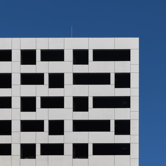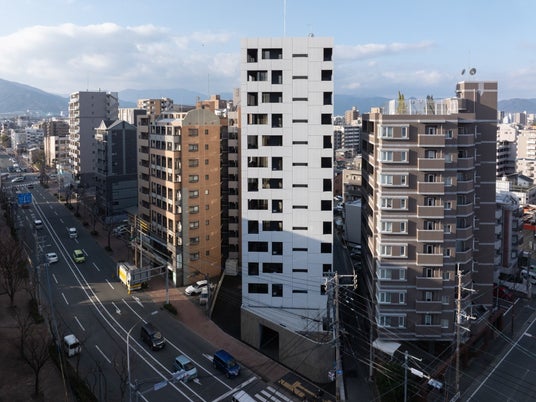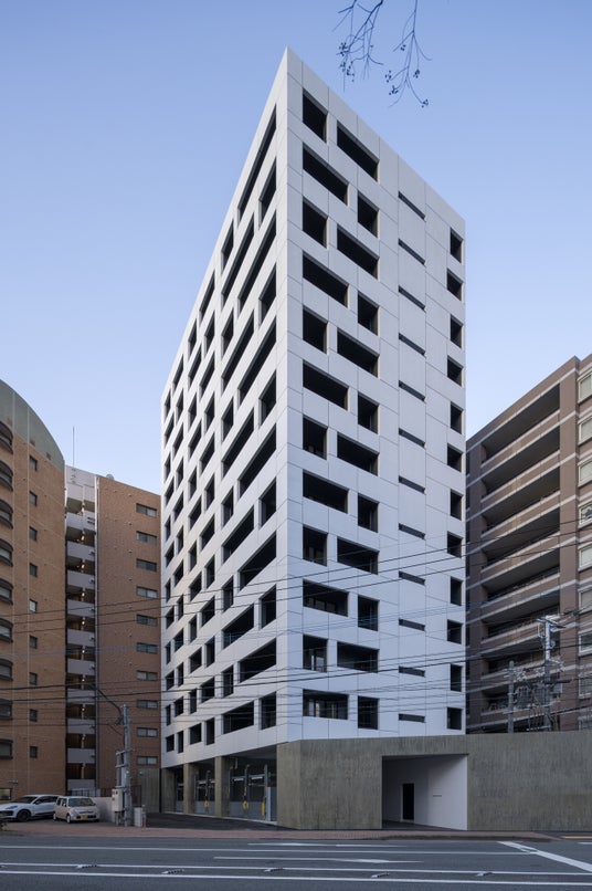 外壁に交互に穿たれた正方形と長方形の開口は、各住戸の「ピクチャーウィンドウ」の役割を果たします。フレーミングにより街の風景を絵画のように見せる効果があると同時に、周囲からの視線も調整しています。
