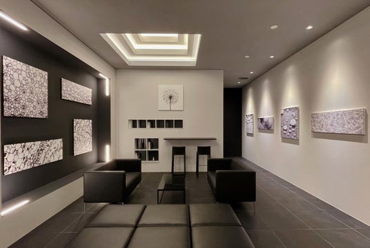 エントランスホールは、直線とシックなモノトーンのマテリアルで構成されながら好奇心を刺激するアート作品に彩られたアーティスティックな空間で、コワーキングスペースとしても利用可能です。