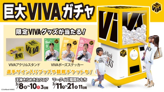 福岡ソフトバンクホークス株式会社(本社:福岡県福岡市 代表取締役社長 CEO:後藤芳光)は、2024シーズン開幕に合わせ街中イベントを実施し、開幕ムードをより一層盛り上げてまいります。イベントの目玉企画として、2024年のスローガン「VIVA(ビバ)」をモチーフにした高さ2.5メートルのキューブ型巨大ガチャが登場。ガチャの抽選に参加すると、選手のサイン入りグッズや限定ノベルティなどの豪華景品が当たります。そのほか、ミニゲームやフォトスポットで写真撮影が楽しめるコーナーも用意。本イベントは、3月8日(金)~10日(日)に天神きらめきスクエアで、11日(月)~21日(金)にMARK IS 福岡ももち2階のももちステージにて開催します。さらに、天神エリア・博多エリアを中心に開幕戦キービジュアルやスローガンをあしらった広告、「VIVAオブジェ」を順次設置。福岡の街中からファンの皆さまと開幕ムードを高めていきます。