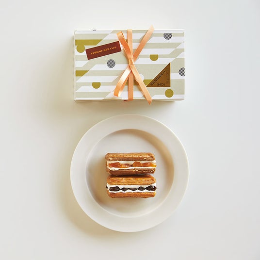 アールグレイにミルクチョコを忍ばせたクリームに、甘酸っぱいアプリコットをのせ、ヘーゼルナッツが香ばしいカカオサブレでサンド。チョコレートの密やかな背景にジューシーな果実と紅茶の香り高さが満ちる、ロマンチックで可憐なおいしさです。
