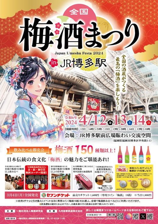 昨年に引き続き今年もJR博多駅前広場 にて「全国梅酒まつり in JR博多駅 2024」が開催されます。日本全国の酒蔵がつくる多種多様な「梅酒」150種以上からお好みの銘柄を飲み比べ、お気に入りの「梅酒」を購入できる大人気イベントです。「全国梅酒品評会2023」金・銀・銅受賞梅酒コーナーも開催。さらに、希少な獺祭梅酒の数量限定有料試飲&抽選販売や梅酒ビールなどの新感覚梅酒ドリンク、お料理とのマリアージュなど内容もりだくさん!