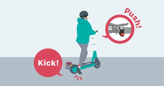 - 足で地面を蹴りながらゆるやかに曲がることができます。走行量の多い道路などを右折する場合には、交差点で電動キックボードを一度降り、横断歩道を押し歩いて渡ってください。