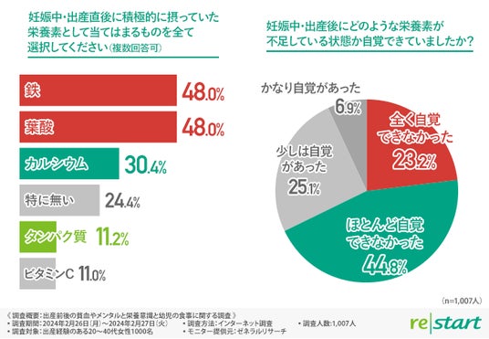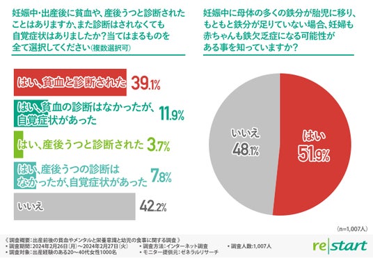 フェリチン検査サービスや分子栄養医学ヘルスケアサービスを提供するリ・スタート株式会社(所在地:東京都港区、代表取締役:谷内 久哉)は、出産経験のある20~40代女性を対象に「出産前後の貧血やメンタルと栄養意識と幼児の食事」に関する調査を実施しました。妊娠中や出産後には、母体の健康維持や胎児の健やかな成長のために適切な栄養素摂取が必要不可欠です。