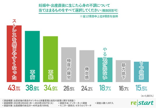 はじめに、「妊娠中・出産直後に生じた心身の不調について当てはまるものをすべて選択してください(複数回答可)」と質問したところ、『ストレスを感じやすくなった(43.1%)』と回答した方が最も多く、次いで『不安(38.9%)』『不眠(34.9%)』と続きました。妊娠中や出産直後は心身が不安定になりやすい傾向にあるようです。
