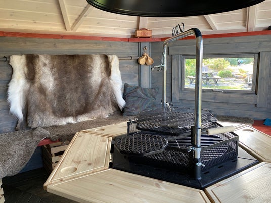 ログハウスの中心にバーベキューグリルがあり、部屋の外周に作り付けの椅子がぐるりと設置されていますので意外と多くの人が入りますので(10名程度)皆で火で囲んでバーベキューを楽しむスタイルをとれます。