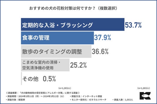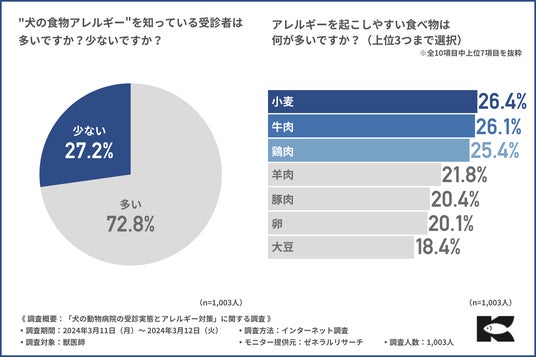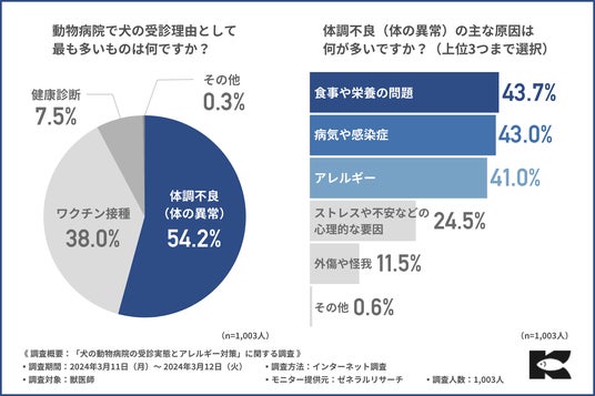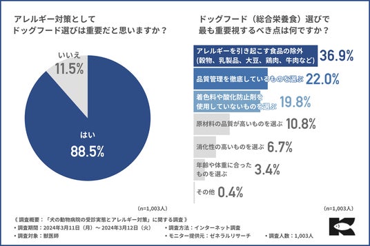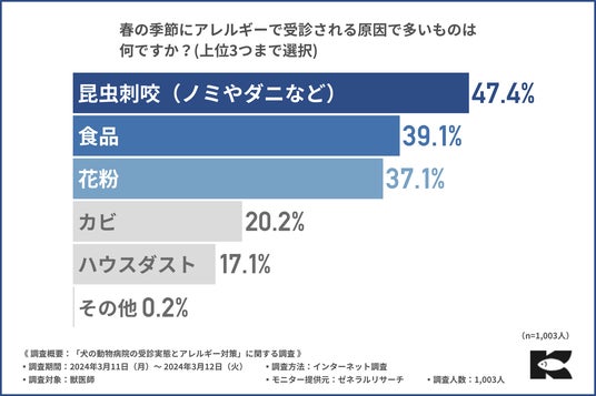 株式会社金虎(本社:静岡県焼津市、代表取締役:寺尾 啓)は、獣医師1,003人を対象に、犬の健康管理とアレルギーに対する対策に関する調査を実施しました。現在花粉症の季節の真っ只中ですが、実は犬にも花粉症があることをご存じでしょうか?花粉症というのは、人間だけでなく犬にとっても大きな問題であり「飼い犬のアレルギー症状への適切な対応がわからない」という飼い主の声も多く聞かれます。犬の花粉症や食物アレルギーの問題は、犬の健康管理を考えるうえで大きな問題です。そこで今回、食物アレルギーに配慮した国産ドックフード「おさかな」(https://www.kanetora-shop.jp/user_data/osakana-lp)を販売している株式会社金虎は、獣医師1,003人を対象に、犬の健康管理とアレルギーに対する対策に関する調査を実施しました。調査概要:「犬の動物病院の受診実体とアレルギー対策」に関する調査