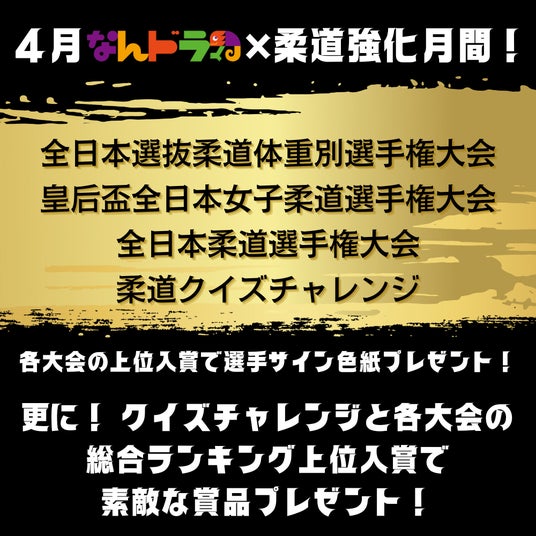 また今月は「なんドラ」柔道強化月間としまして、『2024年全日本選抜柔道体重別選手権大会』の他に、4月21日(日)『第39回皇后盃全日本女子柔道選手権大会 』、4月29日(月・祝)『令和6年全日本柔道選手権大会』の予想企画、そして「なんドラ」オリジナルの『柔道クイズチャレンジ』の4つの予想・クイズ企画を実施します。