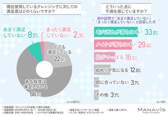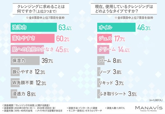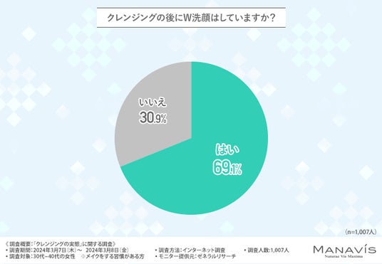 株式会社マナビス化粧品(所在地:千葉県浦安市、代表取締役社長:兼子 慎一)は、30~40代女性を対象に「クレンジングの実態」に関する調査を実施しました。