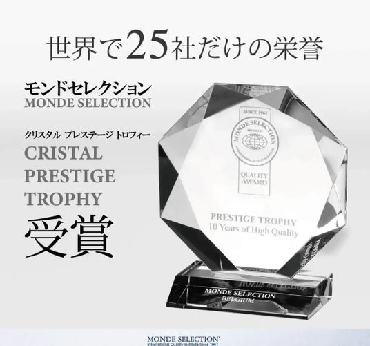 マナビス化粧品はモンドセレクションを10年連続して受賞した証として、モンドセレクションより「クリスタルプレステージ記念トロフィー(2023年度)」を授与されました。このトロフィーは、品質向上を続ける企業に対して贈られる特別なトロフィーです。これからもさらなる品質向上に努め、お客様にご満足いただける商品をお届けしてまいります。
