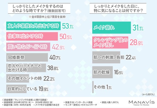 友人や家族と外出する際に頻繁に行う「しっかりメイク」に関する悩みとして、メイク崩れとクレンジング後の残りメイクが最も多く挙げられました。