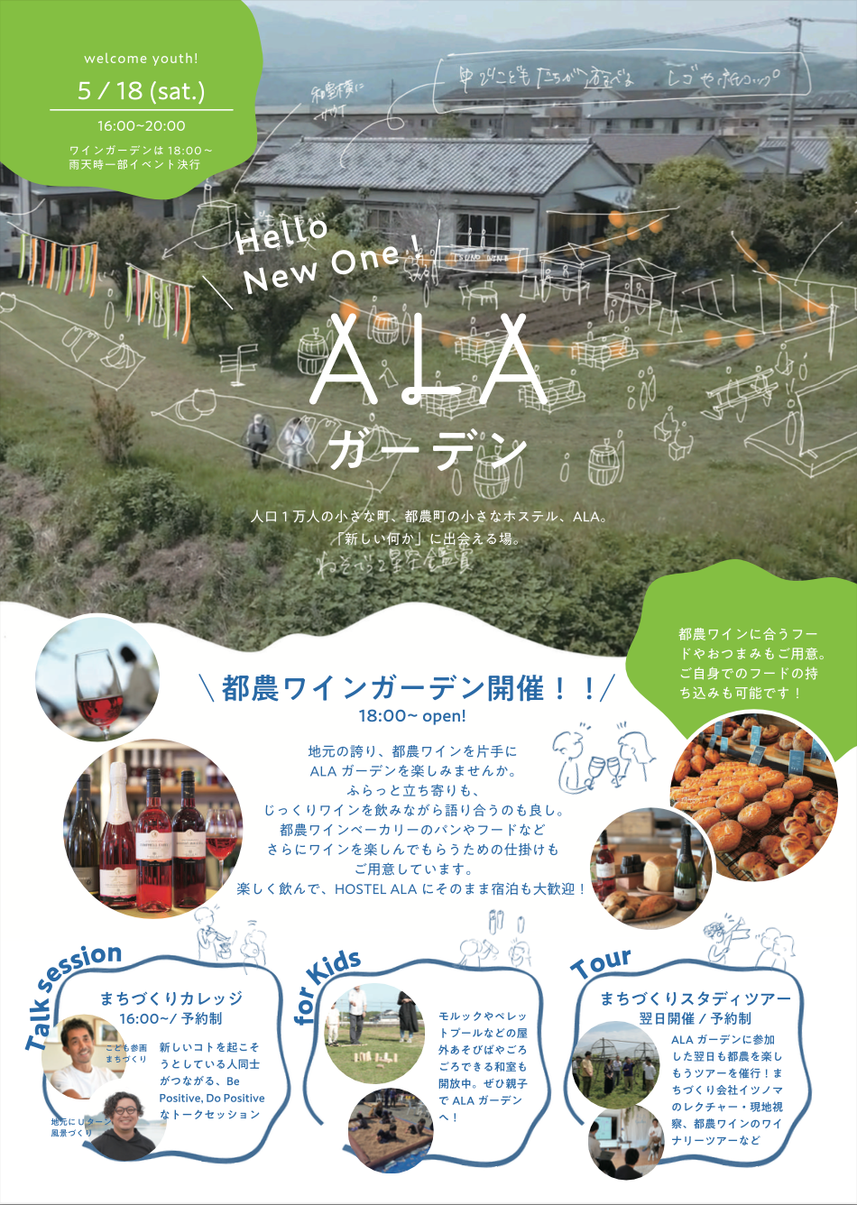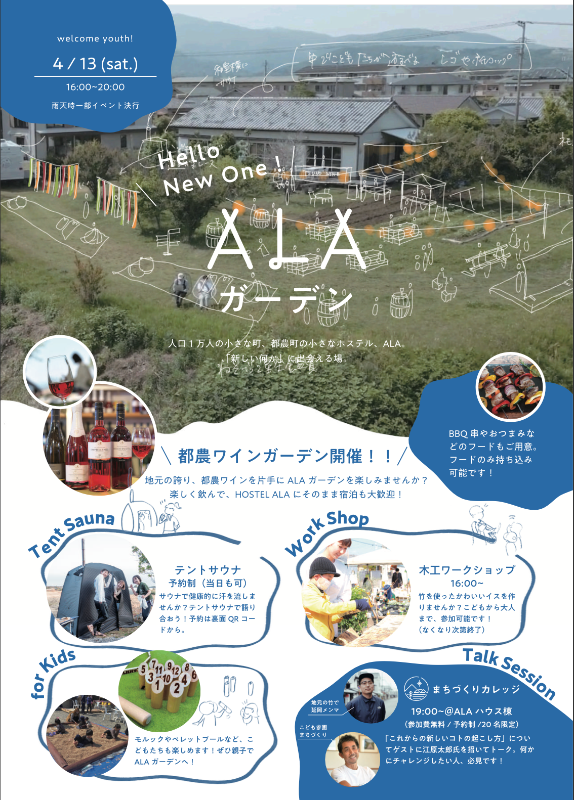 2024年4月より、HOSTEL ALAの敷地を利用して、過疎地で新しいコトをはじめたい人たちが気軽に集まれる定期イベント”ALAガーデン”をはじめました。