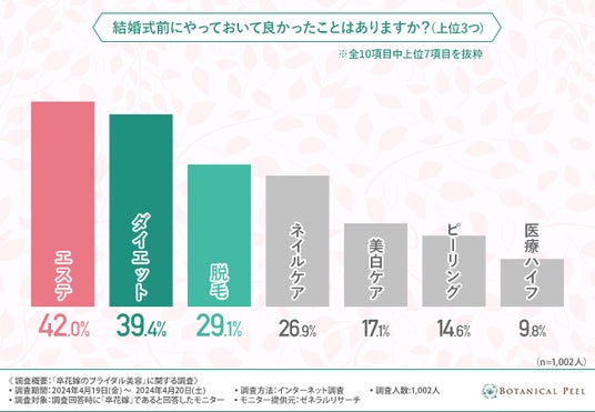 「結婚式前にやっておいて良かったことはありますか?(上位3つ)」と質問したところ、『エステ(42.0%)』と回答した方が最も多く、次いで『ダイエット(39.4%)』『脱毛(29.1%)』と続きました。■エステをやっておいて良かった理由を教えて下さい