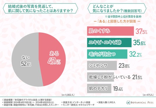 「結婚式後の写真を見返して、肌に関して気になったことはありますか?」と質問したところ、約半数の方が『ある(47.4%)』と回答しました。結婚式前のセルフケアに満足している方が多いものの、約半数の方が後で写真を見返すと気になることがでてくる傾向が示されました。そこで、「どんなことが気になりましたか?(複数回答可)」と質問したところ、『肌のくすみ(37.5%)』と回答した方が最も多く、次いで『ニキビ・ニキビ跡(35.6%)』『毛穴が目立つ(32.2%)』と続きました。約4割が肌のくすみが気になると回答しました。他にもニキビ・ニキビ跡や毛穴など肌に関する悩みも見過ごせません。