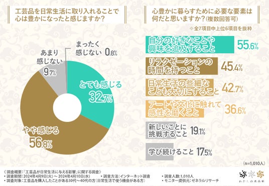 さらに、約9割の方が、工芸品を日常生活に取り入れることにより、日々の生活に彩りが生まれ、心の豊かさが向上したことを実感しており、生活の質の向上にも寄与していることが明らかになりました。