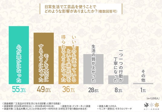 工芸品を使うことで心が豊かになったと感じている方が多いようです。良質なものを使用することで満足感を得ている方が多いことが明らかになりました。