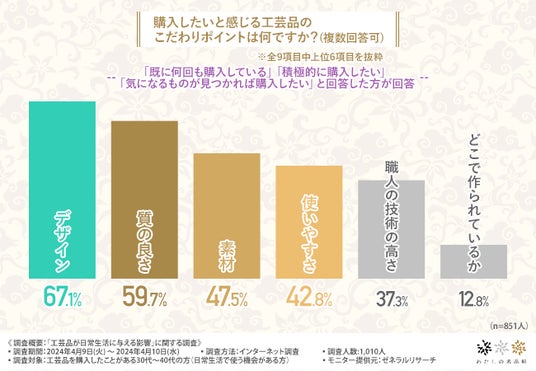 そこで、「既に何回も購入している」「積極的に購入したい」「気になるものが見つかれば購入したい」と回答した方に「購入したいと感じる工芸品のこだわりポイントは何ですか?(複数回答可)」と質問したところ、『デザイン(67.1%)』と回答した方が最も多く、次いで『質の良さ(59.7%)』『素材(47.5%)』と続きました。