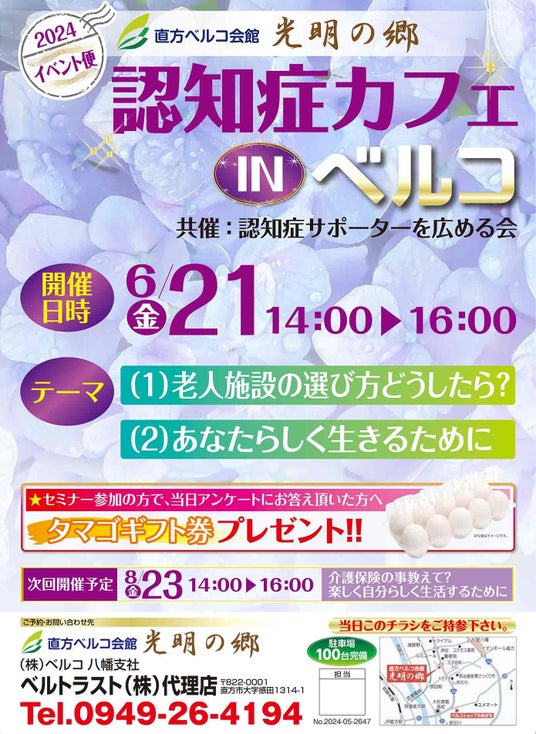 2024年6月21日(金)直方ベルコ会館で「認知症カフェ」を開催いたします