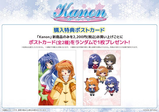期間中、ゲーマーズオンラインショップにて『Kanon』【新商品】を2,200円(税込)お買い上げごとに、特典ポストカード(全2種)をランダムで1枚プレゼント!■ゲーマーズ特典ポストカード(全2種)