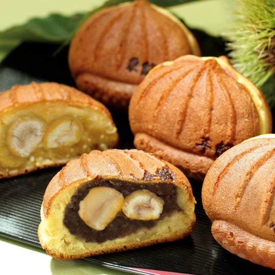 丸ごとの栗2個を5種類の餡で包み込んだ栗饅頭。特性生地でもっちり。