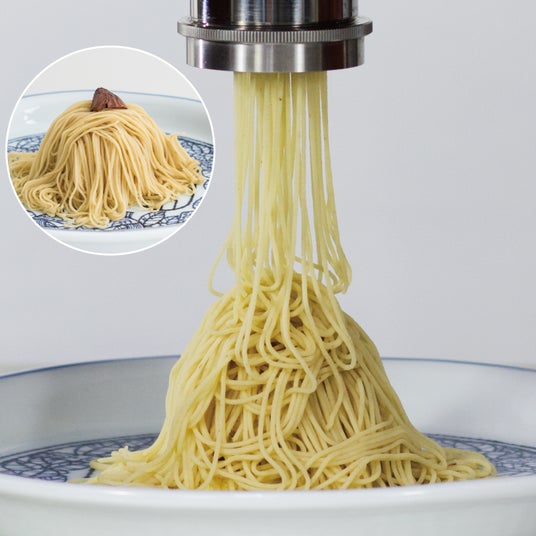 目の目でモンブランクリームを勢いよく絞り出し、長く続く山裾のように盛りつけます。