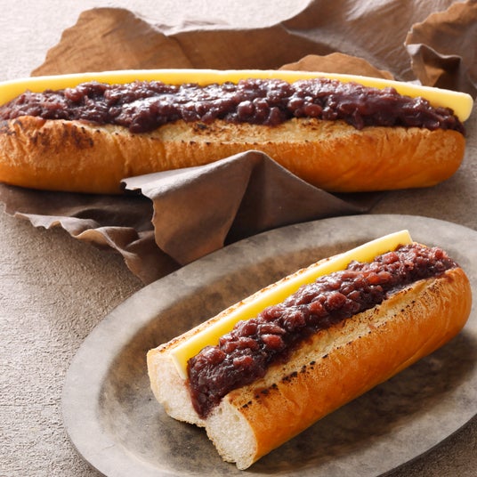 約30cmのソフトフランスパンに、端から端まで粒あんとバターがたっぷり。