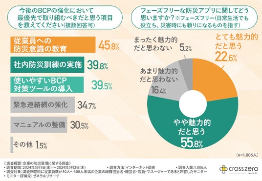 「今後のBCPの強化において最優先で取り組むべきだと思う項目を教えてください(複数回答可)」と質問したところ、『従業員への防災意識の教育(45.8%)』と回答した方が最も多く、次いで『社内防災訓練の実施(39.8%)』『使いやすいBCP対策ツールの導入(39.5%)』と続きました。従業員への防災意識の教育と訓練が上位に上りました。また、使いやすいBCPツールの導入を優先して取り組みたい企業も約4割あるようです。最後に、「フェーズフリーな防災アプリに関してどう思いますか?(単一回答)」と質問したところ、『とても魅力的だと思う(22.6%)』『やや魅力的だと思う(55.8%)』『あまり魅力的だと思わない(16.4%)』『まったく魅力的だと思わない(5.2%)』と回答しました。