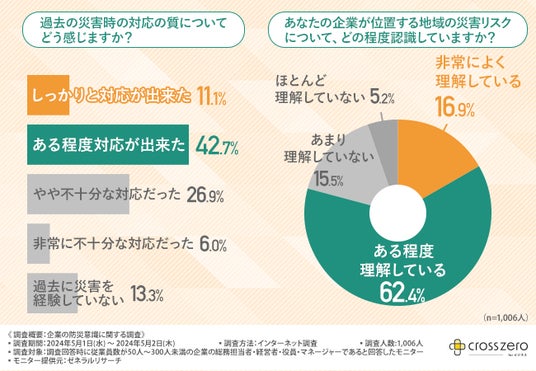 「過去の災害時の対応の質についてどう感じますか?(単一回答)」と質問したところ、『しっかりと対応が出来た(11.1%)』『ある程度対応が出来た(42.7%)』『やや不十分な対応だった(26.9%)』『非常に不十分な対応だった(6.0%)』『過去に災害を経験していない(13.3%)』と回答しました。「しっかりと対応が出来た」「ある程度対応が出来た」を合わせると約半数が災害時の対応についてある程度の質が保てたと感じているものの、対応が不十分だったと感じている方も一定数いることが明らかになりました。また、「あなたの企業が位置する地域の災害リスクについて、どの程度認識していますか?(単一回答)」と質問したところ、『非常によく理解している(16.9%)』『ある程度理解している(62.4%)』『あまり理解していない(15.5%)』『ほとんど理解していない(5.2%)』と回答しました。「非常によく理解している」「ある程度理解している」を合わせると約8割の方が地域の防災リスクを把握していることが示されました。昨今は自然災害が多いこともあり、防災意識が高まっていることがうかがえます。