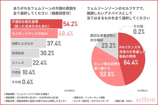 フェムゾーンの不調の主な原因は、フェムゾーンの不適切な衛生習慣と、ホルモンバランスの乱れであることも明らかになりました。フェムゾーンのケアを誤っている女性は多く、衛生習慣を見直すことが大切であるようです。デリケートゾーンのセルフケアで重要なアドバイスとして、PHバランスを適切に保て、かつ洗浄力を考慮した製品を選ぶことが重要であることも示されました。