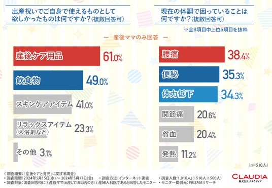 「出産祝いでご自身で使えるものとして欲しかったものは何ですか?(複数回答可)」と質問したところ、『産後ケア用品(61.0%)』 と回答した方が最も多く、次いで『飲食物(49.0%)』 と続きました。約6割が産後の体調を整えるケア用品を出産祝いとして求めていました。「現在の体調で困っていることは何ですか?(複数回答可)」と質問したところ、『腰痛(38.4%)』 と回答した方が最も多く、次いで『便秘(35.3%)』『体力低下(34.3%)』 と続きました。約4割の産後ママさんが、腰痛や便秘や体力低下といった不調を抱えているようです。
