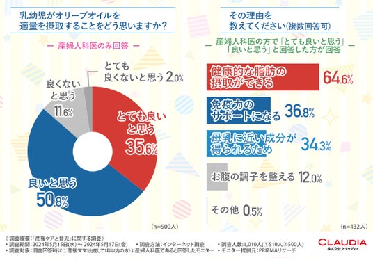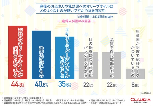 しかし、自分自身のケアと愛する子どもへのケアの両方が叶う子育てができたら素敵ですよね。また、産後に赤ちゃんが摂取した方がいい栄養素や成分を理解することで、ママさんもストレスフリーで子育てできるのではないでしょうか?そこで今回、カシータス・エキストラ・バージン・オリーブオイルを販売する株式会社クラウディア(https://www.claudia.co.jp/)は、産後ママ500人、産婦人科医500人を対象に、「産後ケアと育児」に関する調査を実施しました。調査概要:「産後ケアと育児」に関する調査