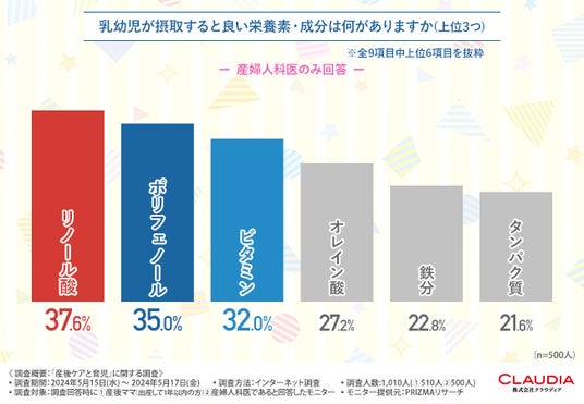 そういった背景からも、産後のママさんが出産祝いとして欲しいものに、約6割が「産後ケア用品」を挙げ、自身の体調や健康管理に注目していることが明らかになりました。続いて、産婦人科医と回答したモニター500人に産後ケアや乳幼児に関しての調査を行いました。